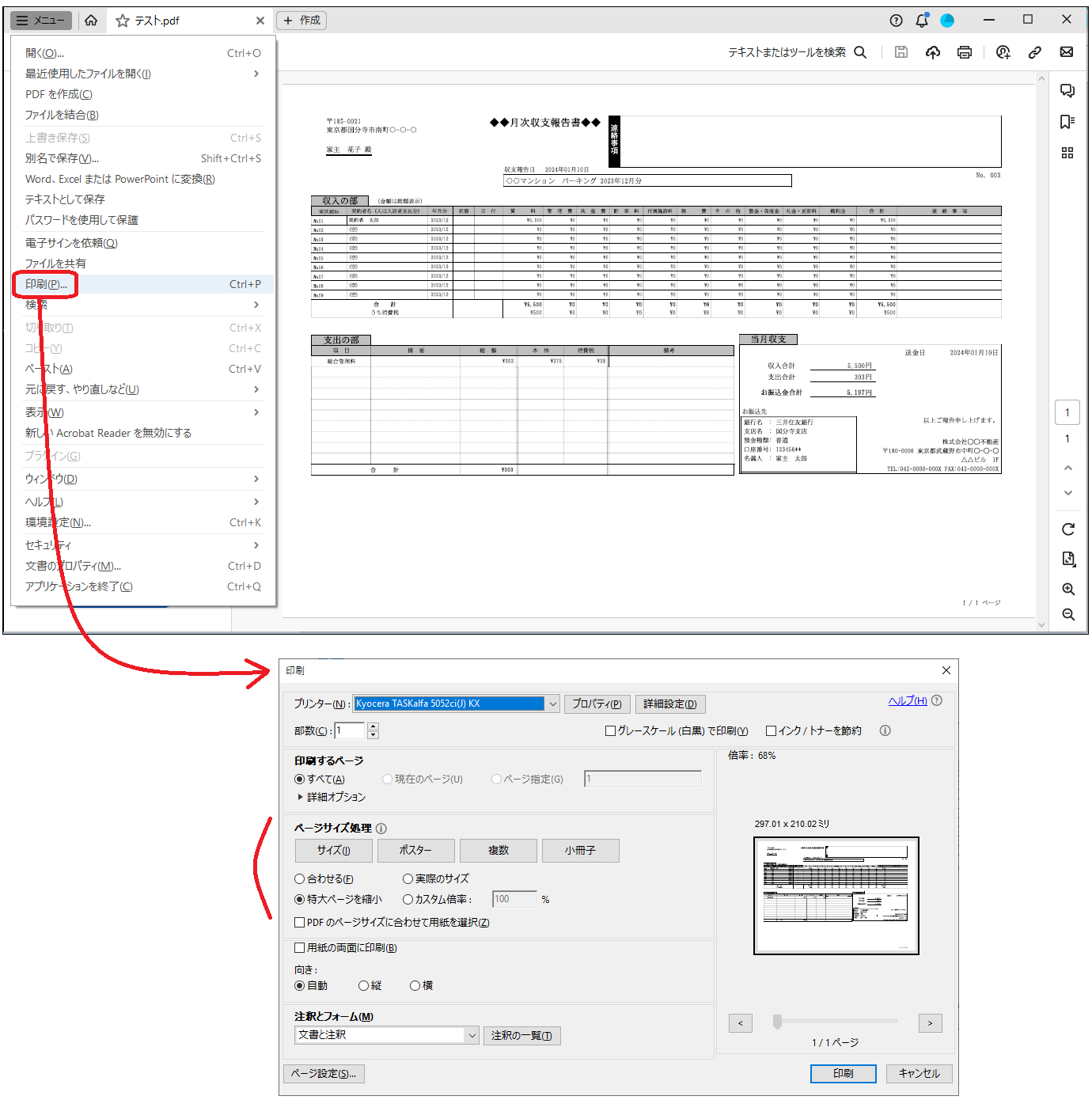 PDF側で印刷サイズ(拡大・縮小)を調整する機能を利用して、用紙を指定します。