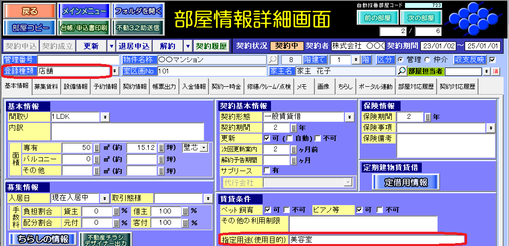 部屋情報詳細画面の[基本情報]タブの[指定用途]項目に入力します。こちらの項目は、賃貸借契約書の事業用の場合のみ使用します。