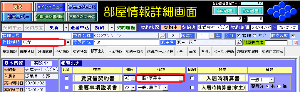 [帳票出力]タブの[賃貸借契約書]ボタンの種類は「○○:事業用」です。