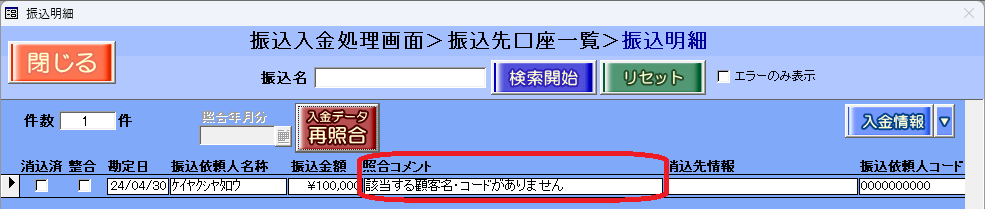 ファームバンキングで照合ができませんので、部屋情報詳細画面の[入金情報]タブの入金レコードを手動で消込してください。各契約状況におけるFBの動作は、弊社FAQ「14013」をご参考ください。