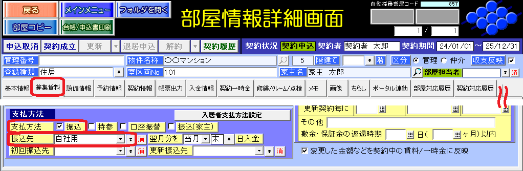 [入居者支払方法設定]ボタン内の[振込]チェックと「振込先」選択が必要です。