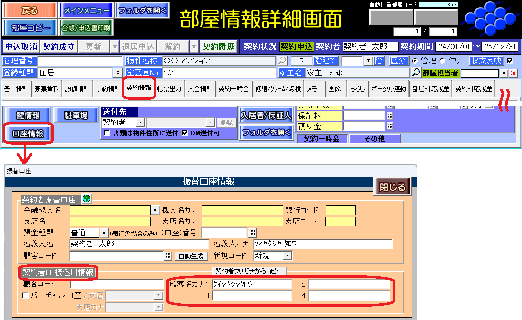 「入居者FB振込用口座」欄の「顧客名カナ1~4」の入力が必要です。