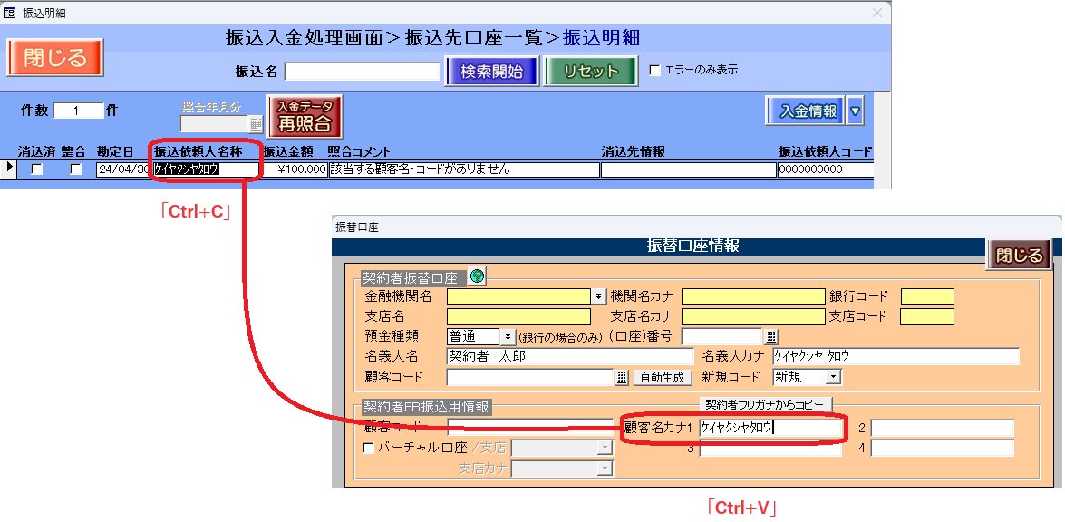ファームバンキングの「振込入金処理画面>振込先口座一覧>振込明細」の「振込依頼人名称」を、キー操作「CTRL+C」でコピーします。そちらを、賃貸名人の[口座情報]ボタン内の「顧客名カナ」欄に、キー操作「CTRL+V」で貼り付けます。