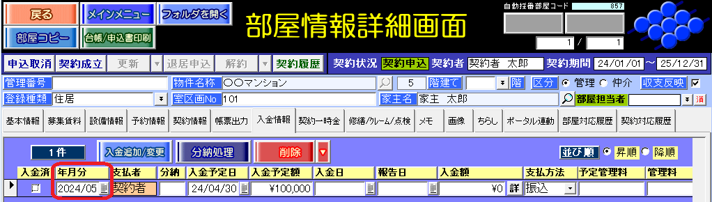 入金レコードを支払者(契約者/入居者)で分ける場合は、[契約情報]タブのプルダウン「支払者」を選択し、[入金情報]タブで入金情報を作成します。詳しくは、弊社FAQ「14073」をご参考ください。
