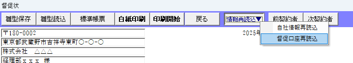 帳票上部右側の[情報再読込▼]ボタンをクリックし、[督促口座再読込]を行います。