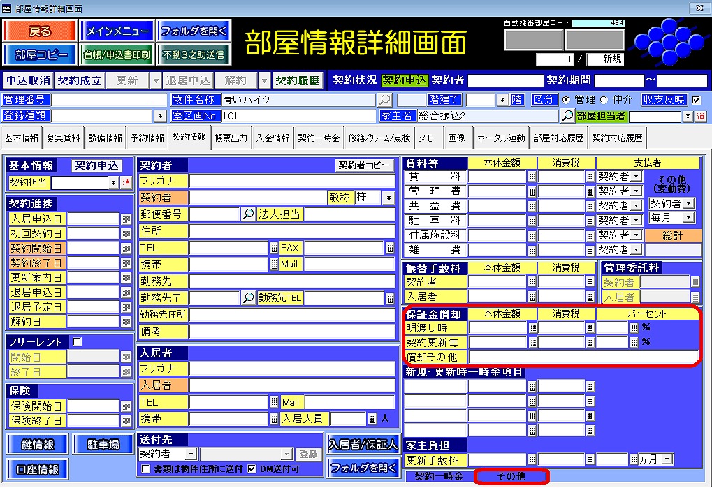 回答・対処方法 部屋情報詳細画面の[契約情報]タブの画面右下にある[その他]をクリックし、[保証金償却]欄に入力します。