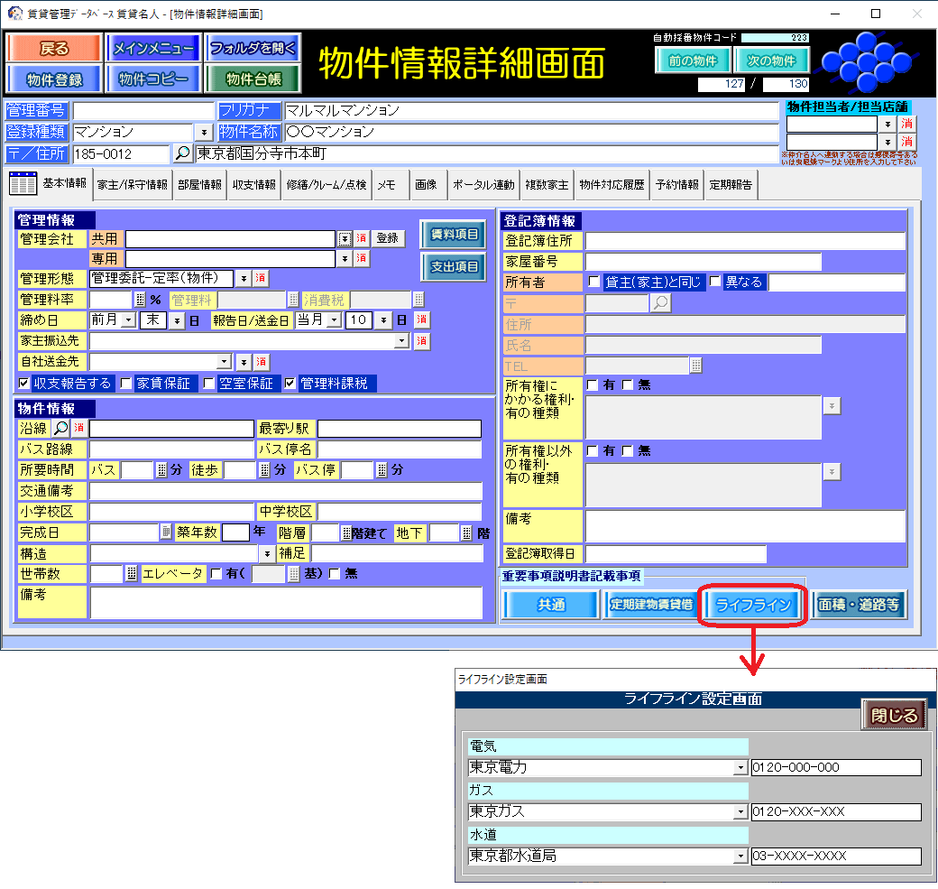 ①物件情報詳細画面の[基本情報]タブの右下[ライフライン]ボタンをクリックします。