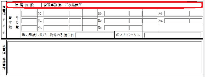 賃貸借契約書 頭書(3)の「付属施設」の反映元はどちらですか。