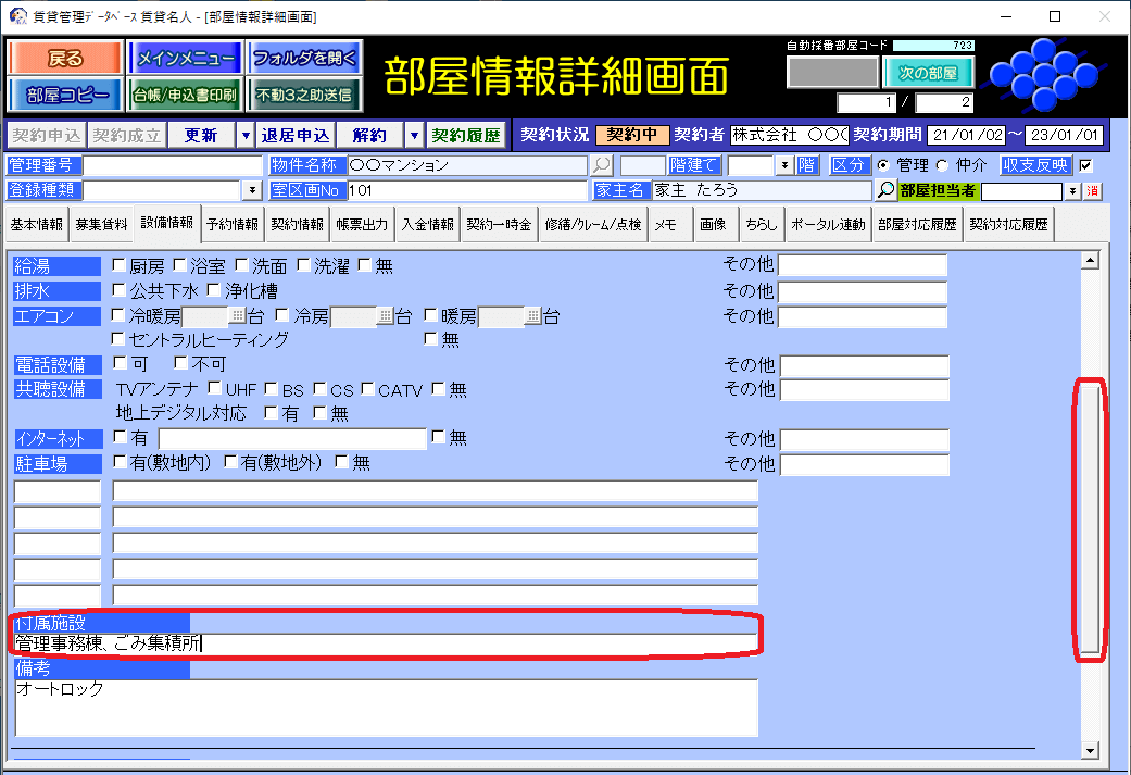 部屋情報詳細画面の[設備情報]タブの「付属施設」欄が反映元です。画面右側のスクロールバーを下にスライドすると、入力欄が表示されます。