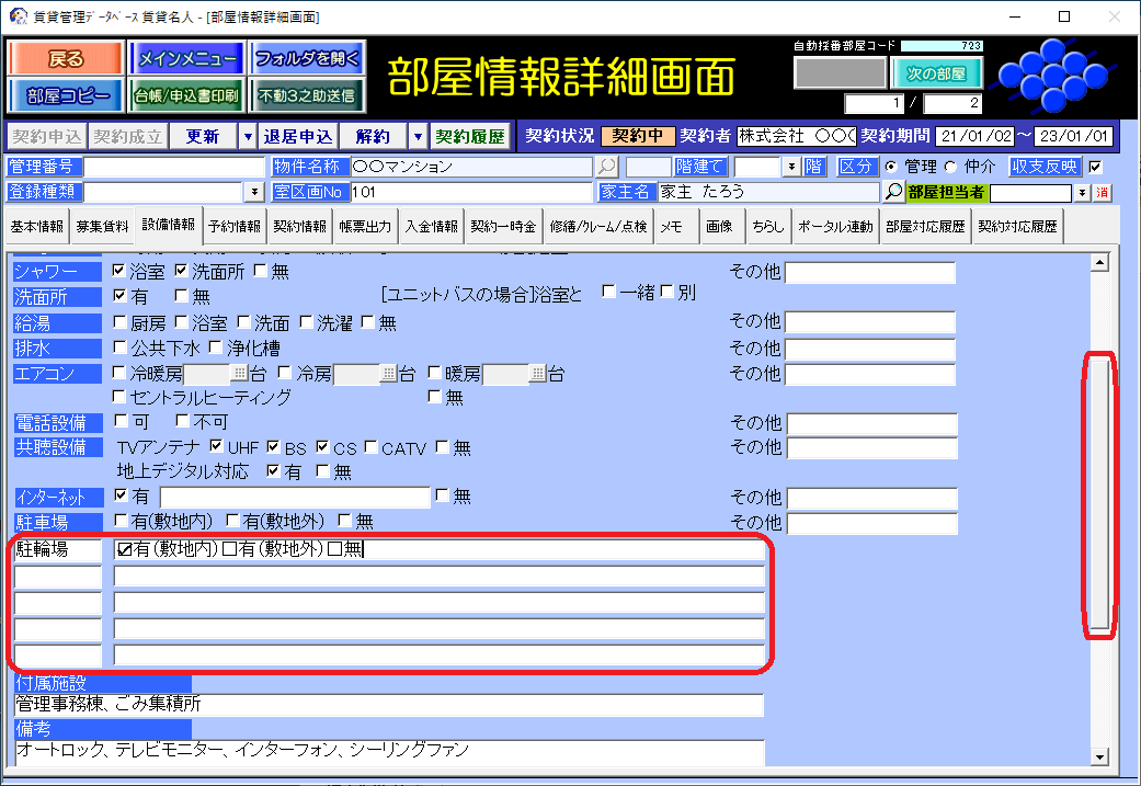 回答・対処方法 部屋情報詳細画面の[設備情報]タブのスクロールバーを下にスライドすると、入力欄が表示されます。建物の設備については、フリー項目欄を 5つ用意しています。