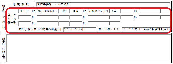 賃貸借契約書 頭書(3)の「貸与する鍵一覧」の以下の項目の反映元はどちらですか。