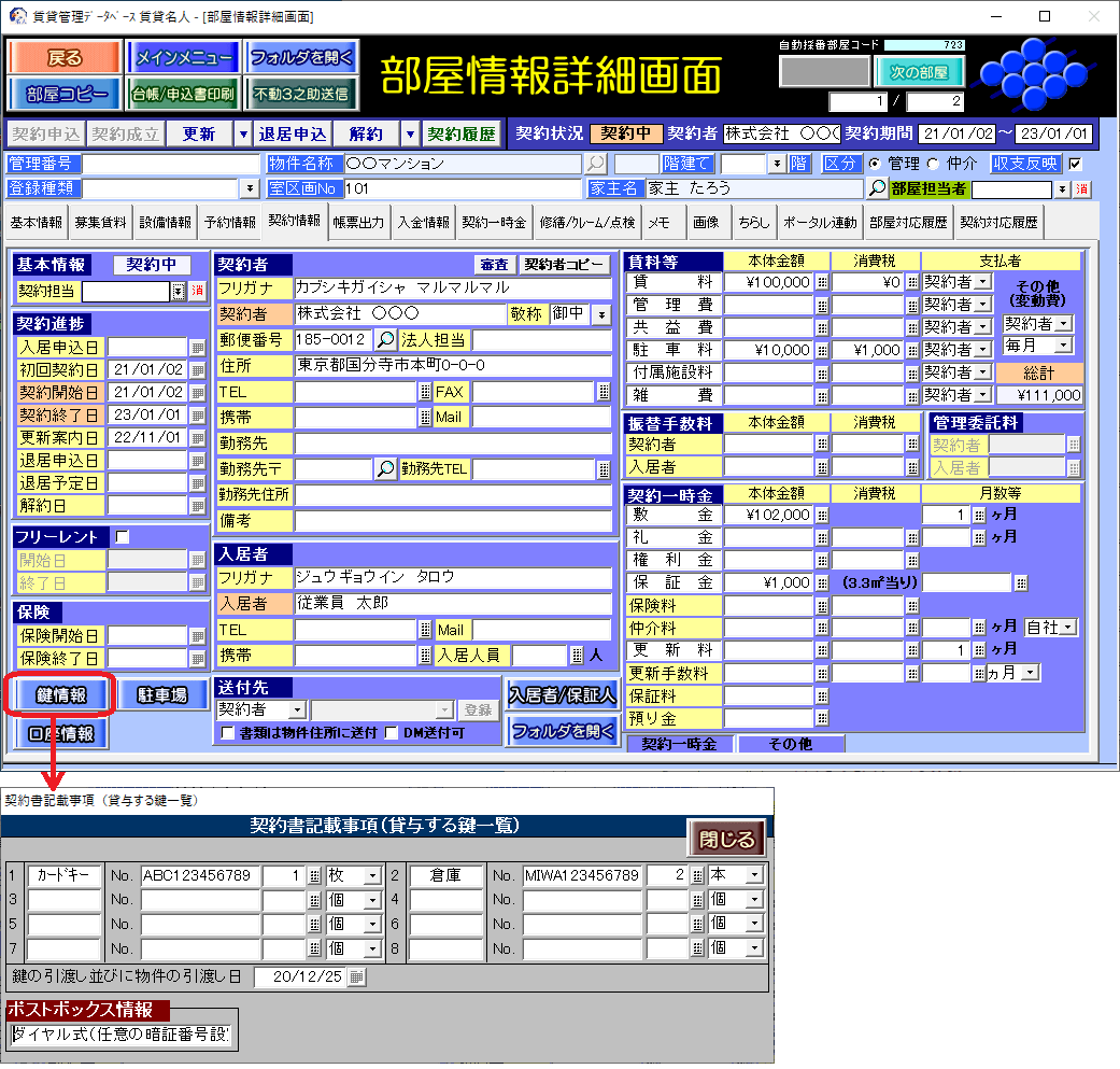 回答・対処方法 部屋情報詳細画面の[契約情報]タブの[鍵情報]ボタン内の「貸与する鍵一覧」が反映元です。