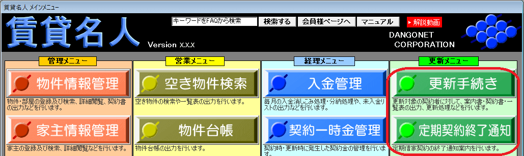 契約終了日が近づくと、メインメニュー「更新手続き」で該当者を表示します。