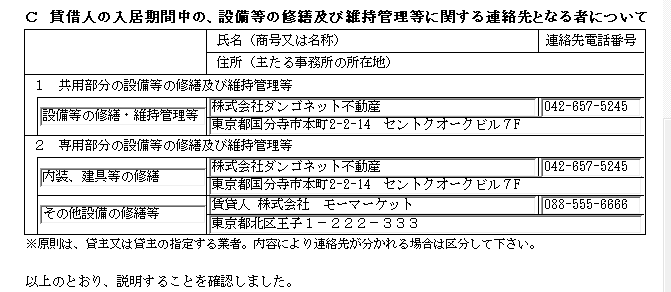 「賃貸住宅紛争防止条例に基づく説明書」の「C 賃借人の入居期間中の設備等の修繕及び維持管理等に関する連絡先となる者について」の記載は、どうすればいいですか?