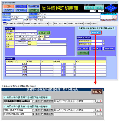 回答・対処方法 物件情報詳細画面の[家主/保守情報]タブの[連絡先入力]ボタンが反映元です。