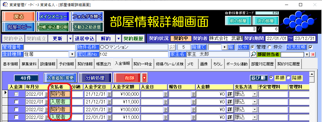 法人契約で、賃料は契約者(法人)・駐車料は個人(従業員)のような場合、入金レコードを支払者「契約者」「入居者」で分けて入金管理をすることができます。
