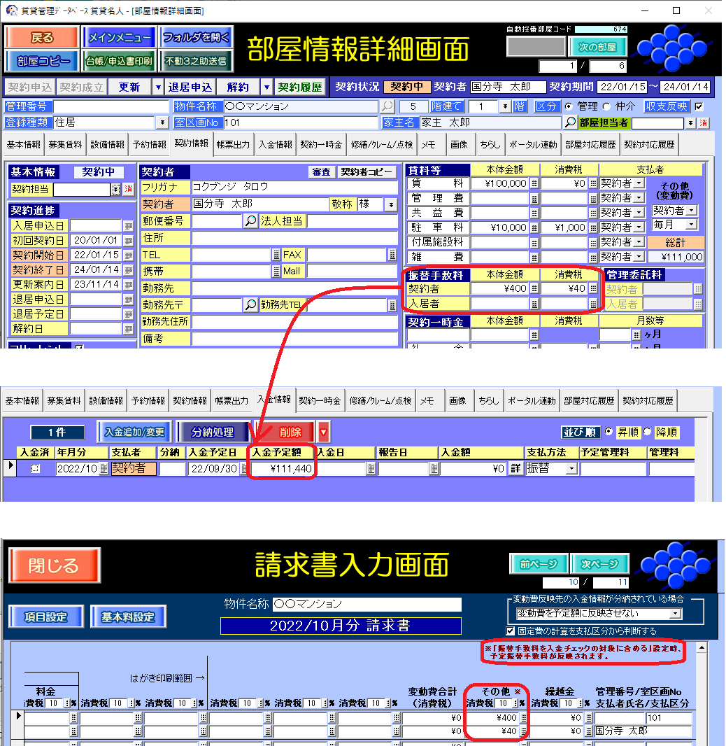 また、本機能を利用した場合、請求書入力画面の「その他」欄にも振替手数料の金額が反映します。設定方法は、部屋の月単位と、毎月の物件単位の2パターンです。