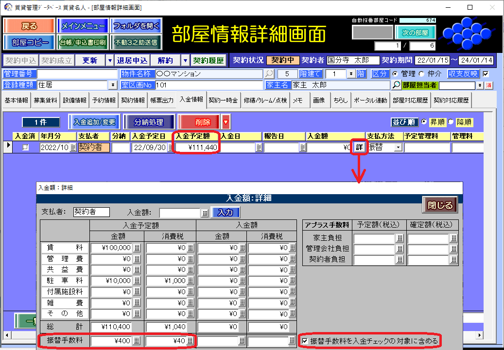 部屋情報詳細画面の[入金情報]タブの入金レコードの[詳]ボタンをクリックし、[振替手数料を入金チェックの対象に含める]チェックを付けます。