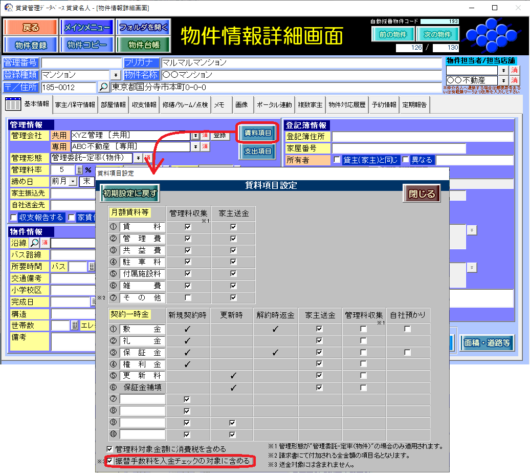 物件情報詳細画面の[契約情報]タブの[賃料項目]ボタンをクリックし、[振替手数料を入金チェックの対象に含める]チェックを付けます。