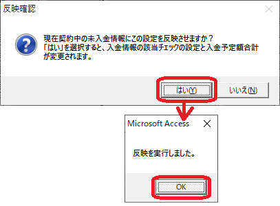 「はい」を選択すると、入金情報の該当チェックの設定と入金予定額合計が変更されます。」