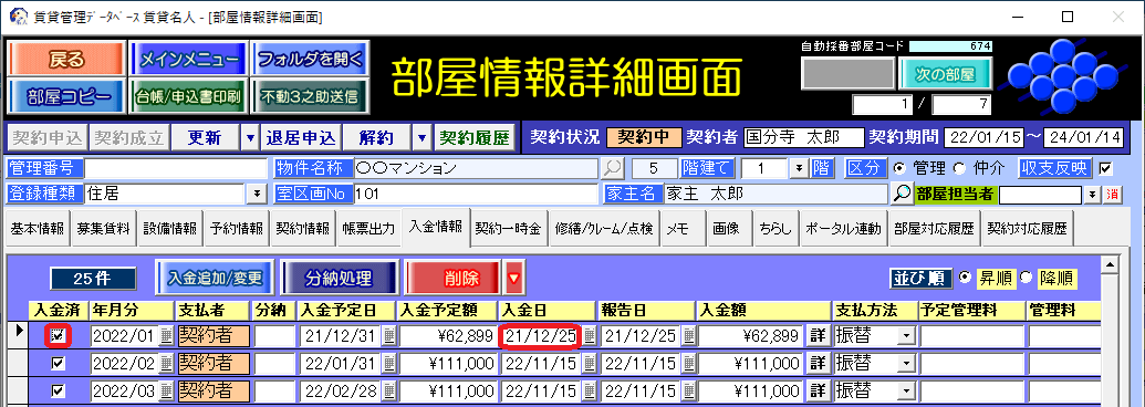 賃貸名人で入金管理する場合は、部屋情報詳細画面の[入金情報]タブに入金レコードを追加します。入金レコードを追加する方法は弊社FAQ「14070」を、初月を日割り計算させた入金レコードを作成する方法は弊社FAQ「14005」でご確認いただけます。