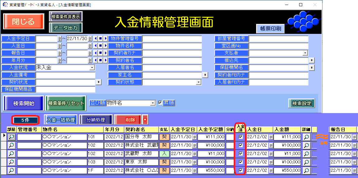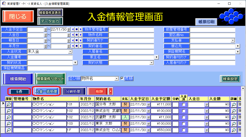 検索画面に表示されている入金情報の「入金日」だけを一括で設定します。