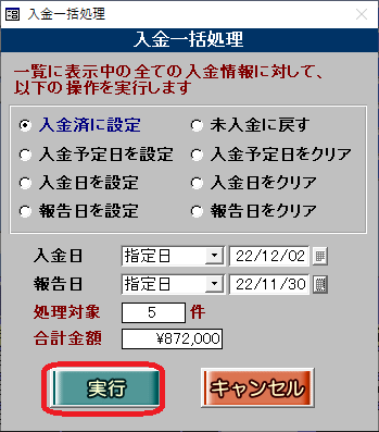 (2)「入金済に設定」を選択し、「入金日」「報告日」を入力して[実行]ボタンクリックします。