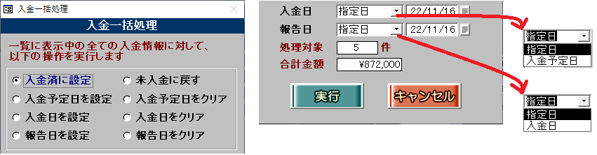 入金一括処理画面の指定は、操作したい内容により以下の選択肢を用意しています。