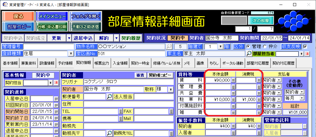 [契約情報]タブの「賃料等」欄の金額を変更します。