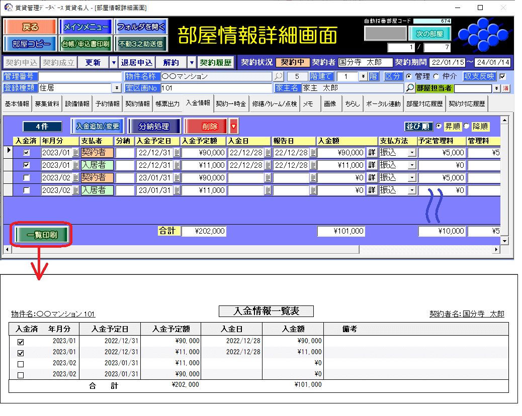 借りている部屋単位の場合、[入金情報]タブの[一覧印刷]ボタンを利用します。