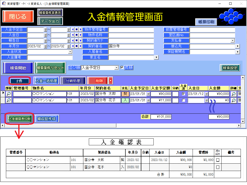 2.入金情報管理の[入金確認表印刷]ボタンで作成する