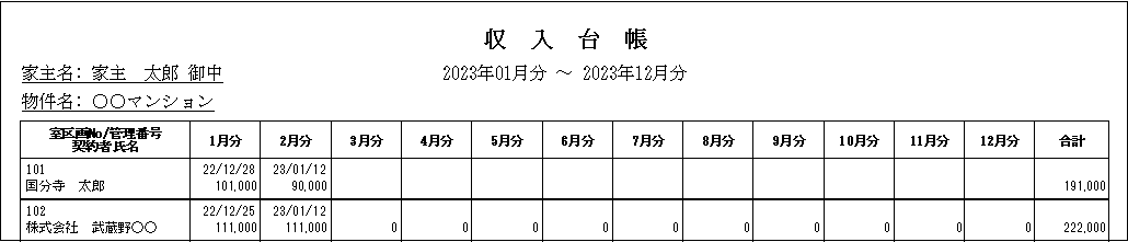 物件毎に、1年単位(例:2023年01月分~12月分)で、一覧表を作成することができます。賃料等の入金金額を合計で表示します。