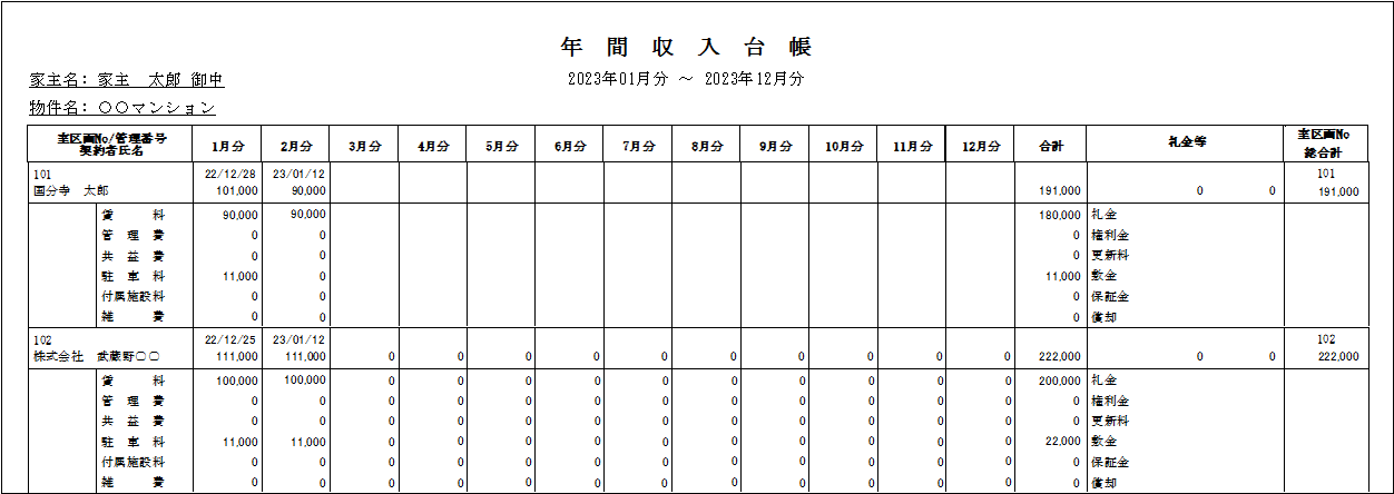 物件毎に、1年単位(例:2023年01月分~12月分)で、一覧表を作成することができます。賃料等の内訳、契約一時金の入金金額を表示します。