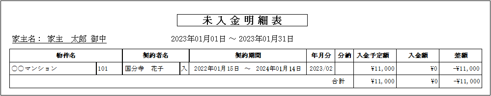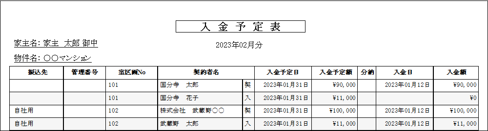 家主毎に、入金予定日を期間指定(例:23/01/01-23/01/31)して、一覧表を作成することができます。