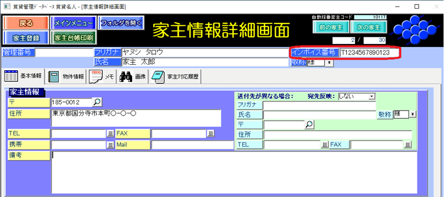 インボイス制度(令和5年10月01日施行)に伴う適格請求書発行事業者登録番号は、家主の登録番号は家主情報詳細画面の「インボイス番号」欄に登録します。