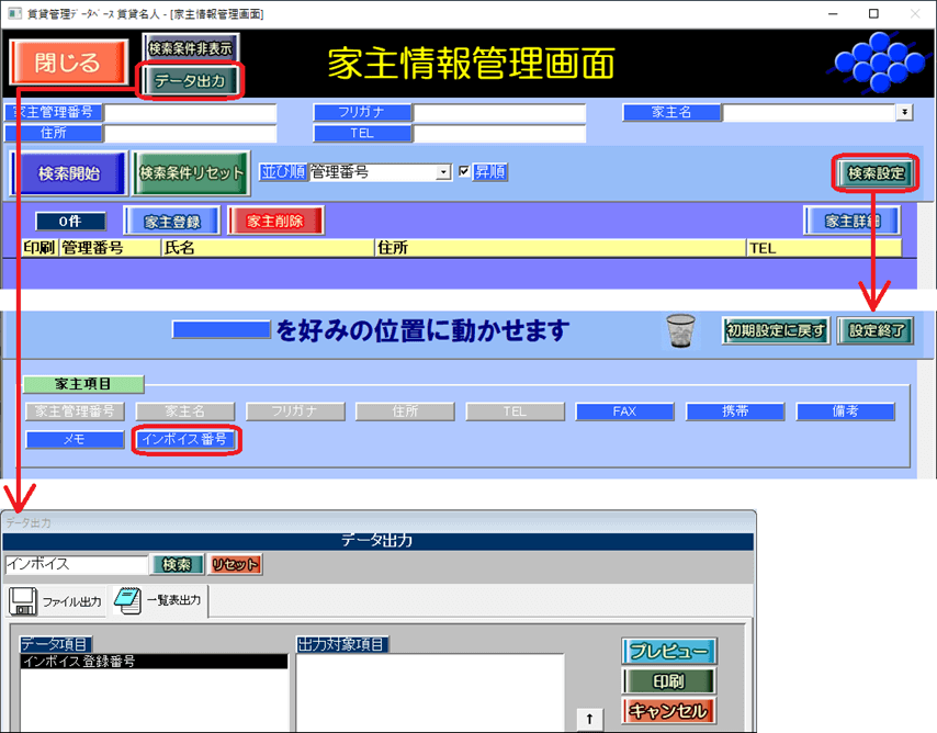 登録した「インボイス番号」は家主情報管理画面の[検索設定]ボタン内の検索項目「インボイス番号」で検索ができます。また、[データ出力]ボタン内のデータ項目「インボイス登録番号」を用い、一覧表を作成することができます。