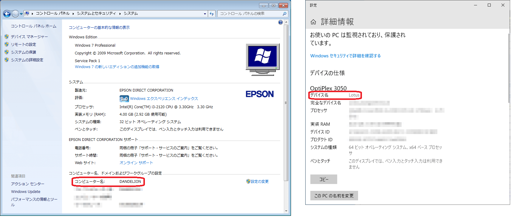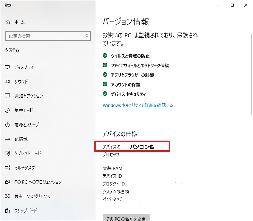 ・Windows10、11は、「デバイス名」欄にパソコン名が表示されます。