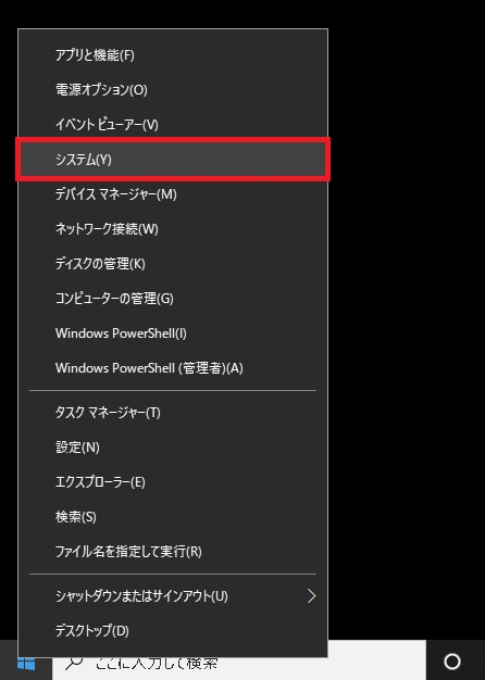 ①スタートボタンの上で右クリックし、「システム」を選択します。