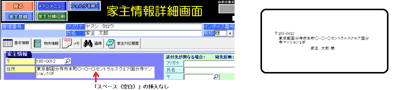 チェック無:部屋情報詳細画面の[契約情報]タブの契約者住所欄を印字します。