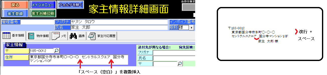 「住所」欄の改行は、「スペース(空白)」の挿入で指定をします。