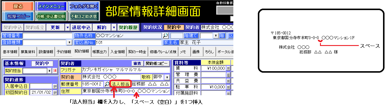 部屋情報詳細画面の[契約情報]タブの送付先「契約者」(初期値)の場合、宛名住所は[書類は物件住所に送付]チェックの有無を参照します。