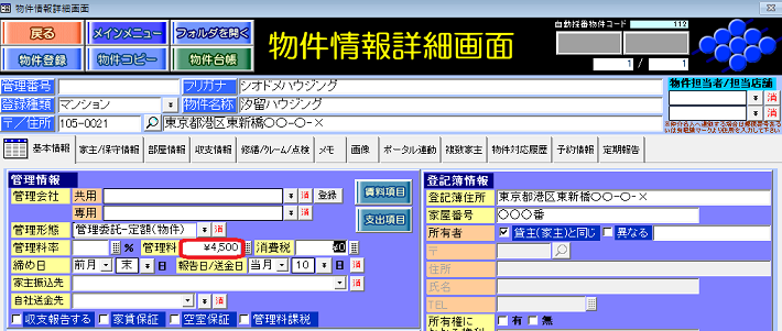 回答・対処方法 [物件情報詳細画面]の[基本情報]タブの「管理料」欄に管理料を入力します。