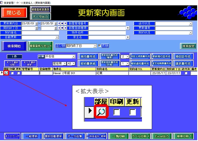更新案内画面を開いている場合は、[🔎]ボタンを押すと部屋情報詳細画面が開けて便利です。