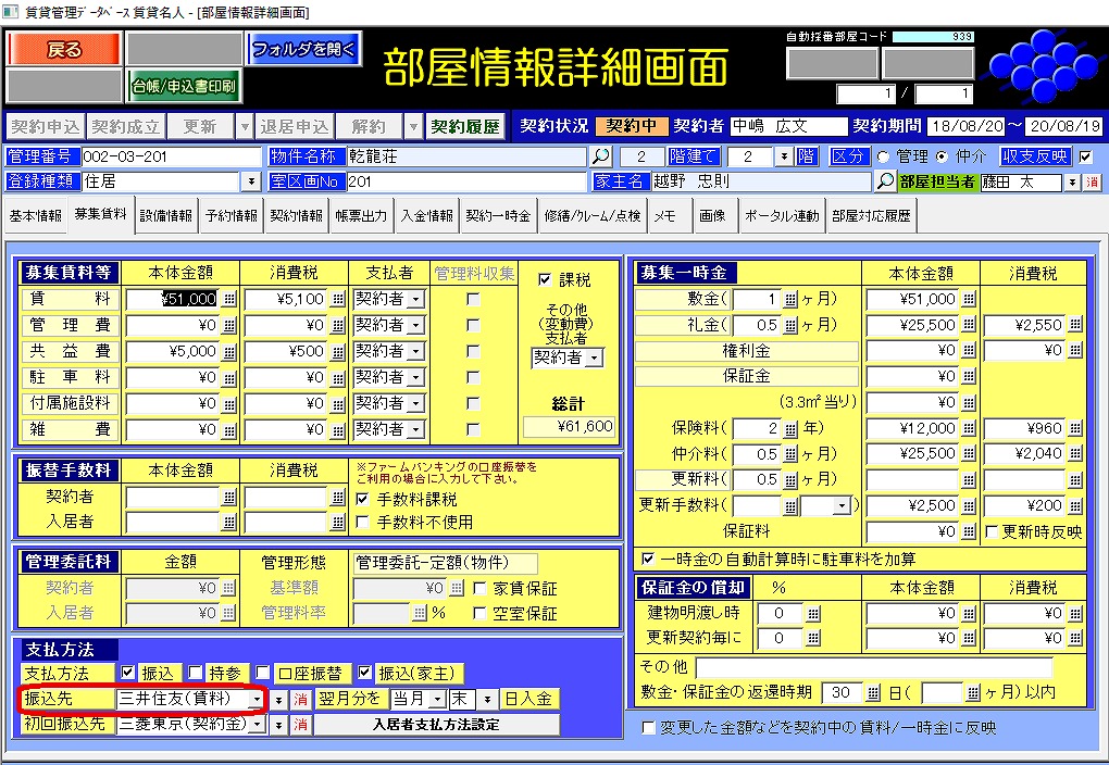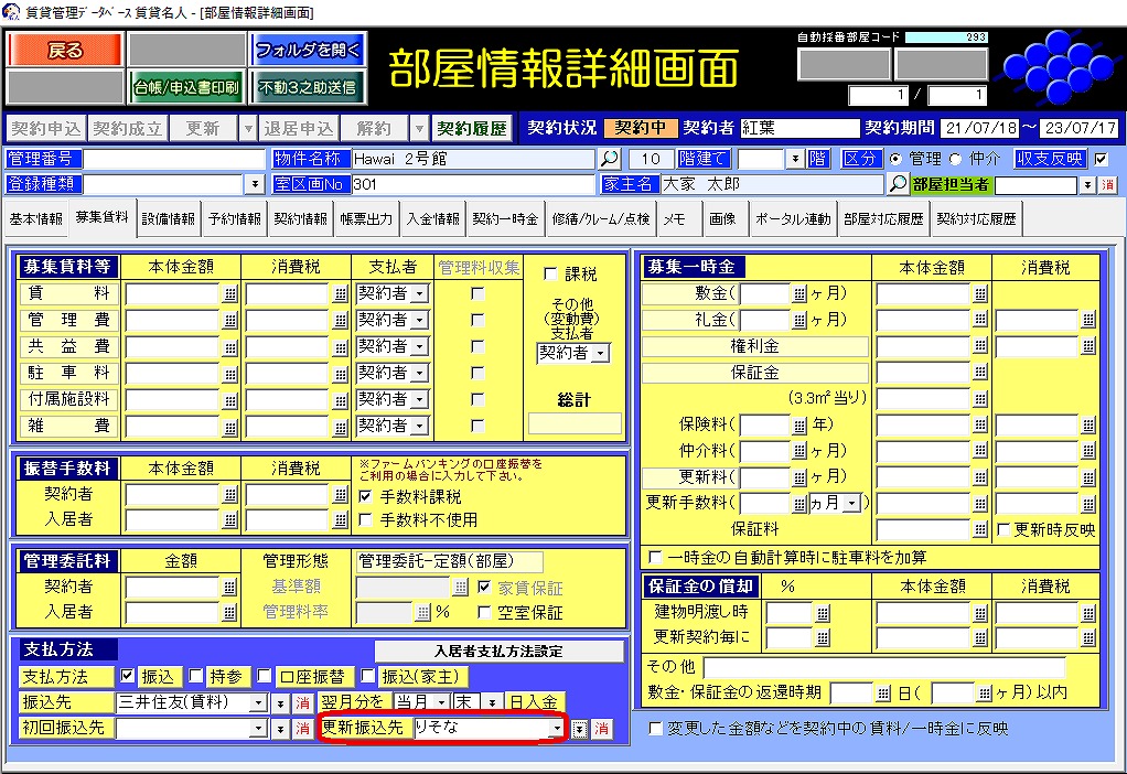 お振込先欄は直接手入力が可能ですが、[データ収集]ボタンを押すと入力内容がリセットされます。自動反映を希望される場合、部屋情報詳細画面の設定を行います。