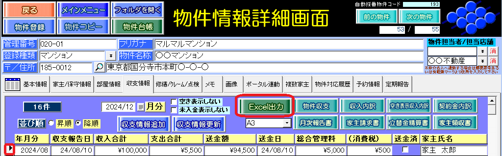 ・物件情報詳細画面の[収支情報]タブの[Excel出力]ボタン