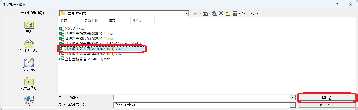ウインドウ「テンプレート選択」でファイルを選択し、[開く(O)]ボタンをクリックします。