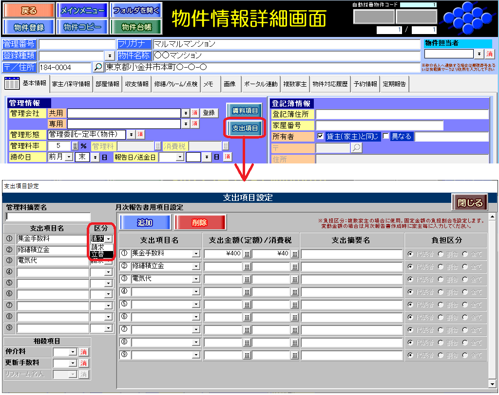 家主請求書の「項目」欄は、設定により表示・非表示 が制御されます。 物件情報詳細画面の[基本情報]タブの[支出項目]ボタンの「区分」欄で指定をします。