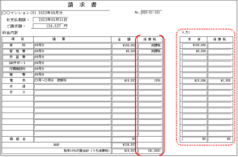 画面上の「入力:」欄の「本体金額」の入力がなく、「消費税」がブランクの場合、請求書の「消費税」欄はブランクで表示します。