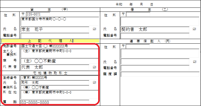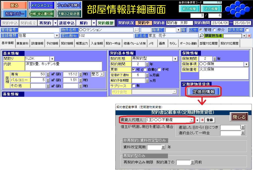 回答・対処方法 賃貸借契約書(定借用)の上記代理人は、 部屋情報詳細画面の[帳票出力]タブの[定借用情報]ボタン内「賃貸人代理人」で指定をします。