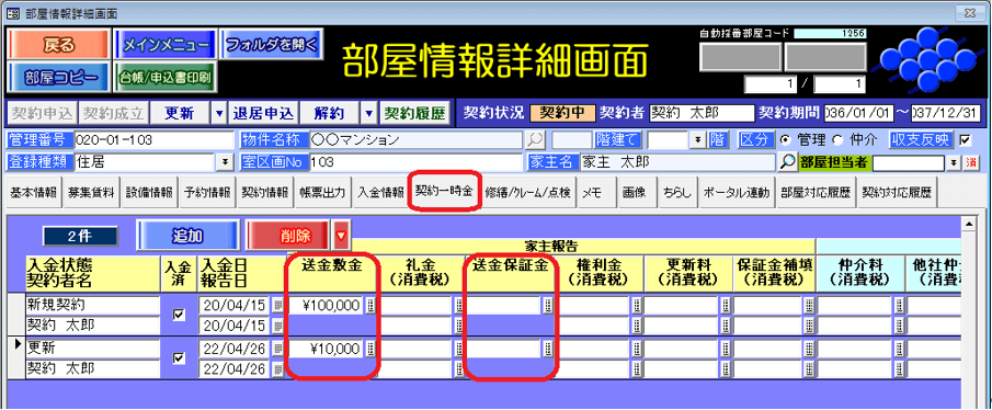・部屋情報詳細画面の[契約一時金]タブの設定